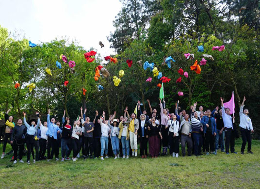 春光烂漫,山野风清,大家一进入园中,就在一片宽阔的大草坪上做起了有趣的热身运动,平日里表情呆板的道桥设计师立刻变成了活泼可爱的小学生,所有队员很快融进了轻松愉快的氛围里。热身结束后,原来站好的队形经历几次随意变换后,分成了六个小组,无论你在公司什么岗位、从事什么专业,无论是领导还是员工,在新组合的队伍里,只有一个身份,那就是“队员”。随后,各队选出了一名队长,负责领任务、领队旗、队服,一时间,穿上不同颜色队服的六个小队,仿佛翠绿的草坪上开出了六朵艳丽的大花。队服是区别队伍的标志,而队旗则代表集体思想和队员精神风貌,各队纷纷在旗帜上亮出各自的队名和口号。